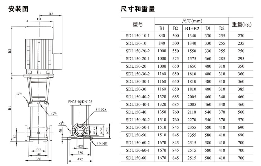 SDL150/SDLT150立式多級離心泵其管道式結構可以確保泵可直接安裝在進出在同一水平線上且管徑相同的水平管路系統中,這種設計使泵的結構和管路更為緊湊。